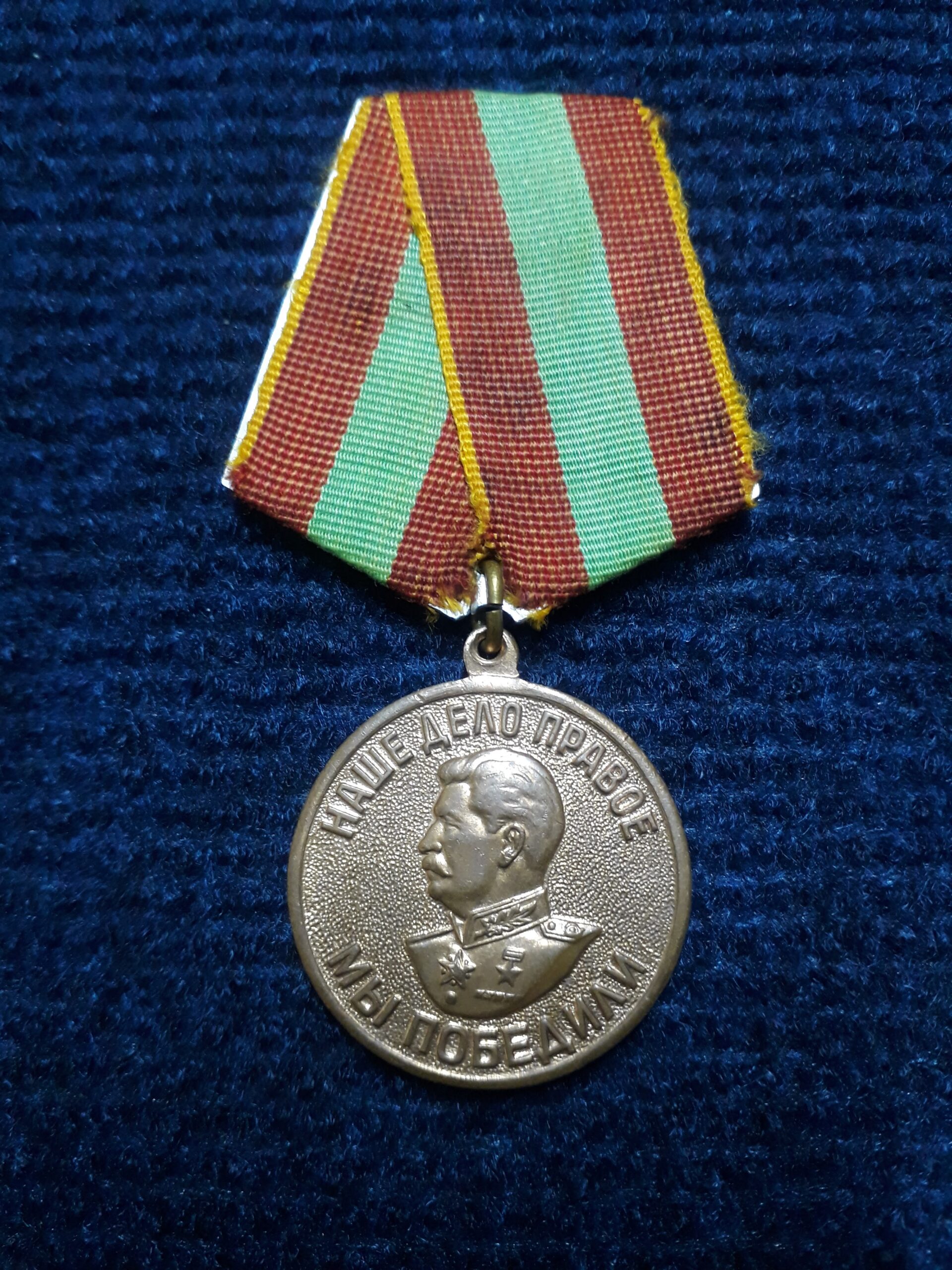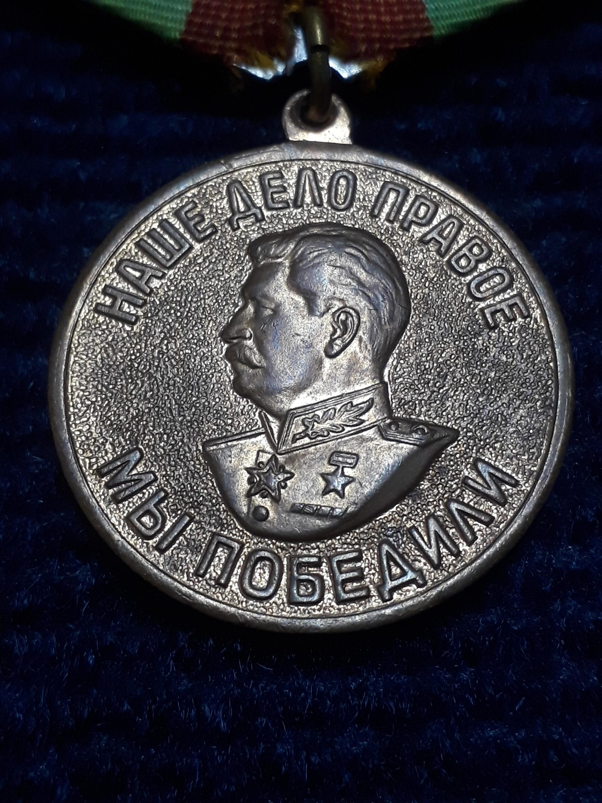No anverso apresenta o busto de Stalin acompanhado da inscrição “Nossa causa é justa – Nós vencemos”. No reverso, a inscrição em russo referente ao trabalho valente na guerra de 1941–1945, juntamente com o símbolo da foice e martelo.